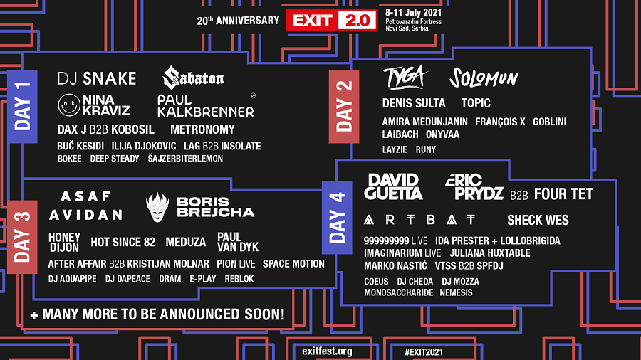Velika proslava 20. godišnjice EXIT festivala održaće se od 8. do 11. jula 2021. na Petrovaradinskoj tvrđavi, a svoje nastupe već su potvrdila neka od najvećih svetskih i regionalnih imena, kao što su David Guetta, DJ Snake, Tyga, Eric Prydz b2b Four Tet, Asaf Avidan, Artbat, Meduza, Paul Kalkbrenner, Nina Kraviz, Boris Brejcha, Sheck Wes, Hot Since 82, Solomun, Paul van Dyk, Sabaton, Metronomy, Honey Dijon, Dax J, Kobosil, Denis Sulta, Topic, Laibach i mnogi drugi. Svi detalji u vezi sulaskom na festival biće na vreme objavljeni na zvaničnom sajtu Exita, u skladu s budućim epidemiološkim merama Vlade Republike Srbije.