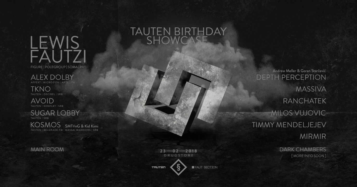 Izdavačka kuća i organizacija Tauten kompletirala je danas line up na dva stejdža svoje velike rođendanske žurke u klubu Drugstore. Na ovom događaju, zakazanom za 23. februar, publika će moći, osim Portugalca Lewis Fautzi-ja i Italijana Alex Dolby-ja, da čuje i 12 poznatih domaćih di-džejeva!